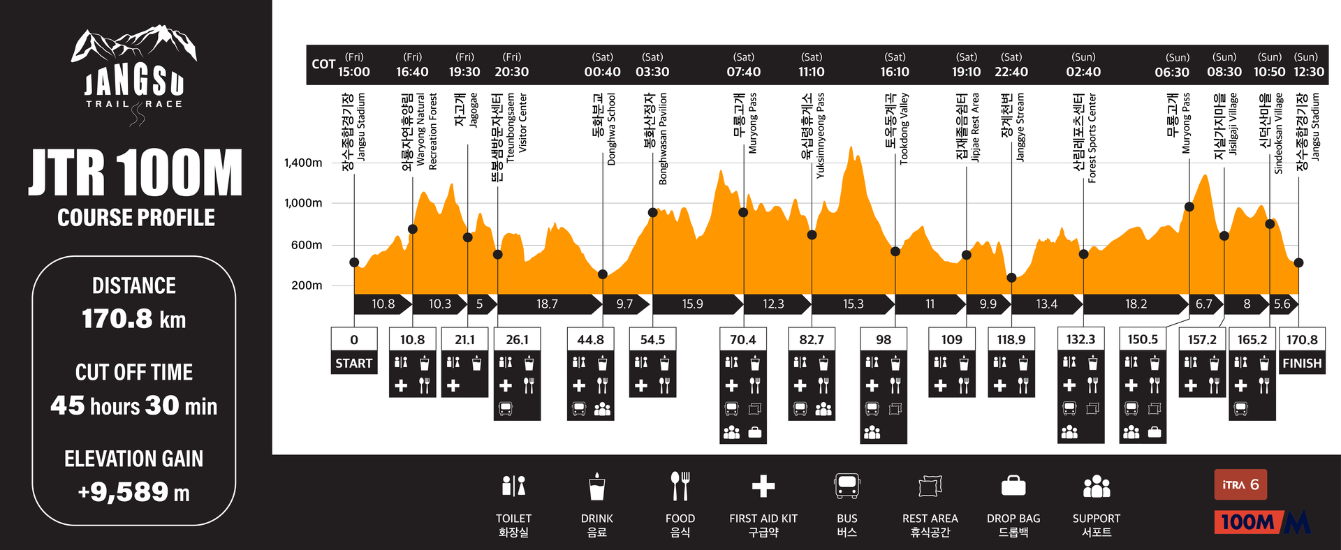 | 무룡고개 | M11 | 150.5 | 물,이온음료,콜라, 커피 | 바나나 | 삼각카스테라, 땅콩, 식염포도당, 아미노샷 | 밥, 김가루, 사골육수, 77방앗간 참기름 |