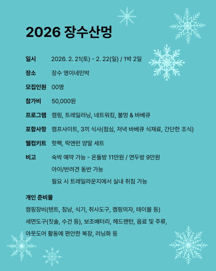 ✅ 개인 지참: 캠핑장비, 세면도구, 보조배터리, 헤드랜턴, 음료 및 주류, 운동복, 러닝화, 여벌옷 등